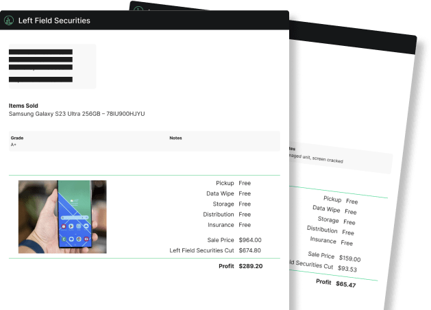 Left Field Securities can come to any of your locations at no cost and provide an example intake report to show how your assets would be inventoried, disposed and an expected return amount after resell.